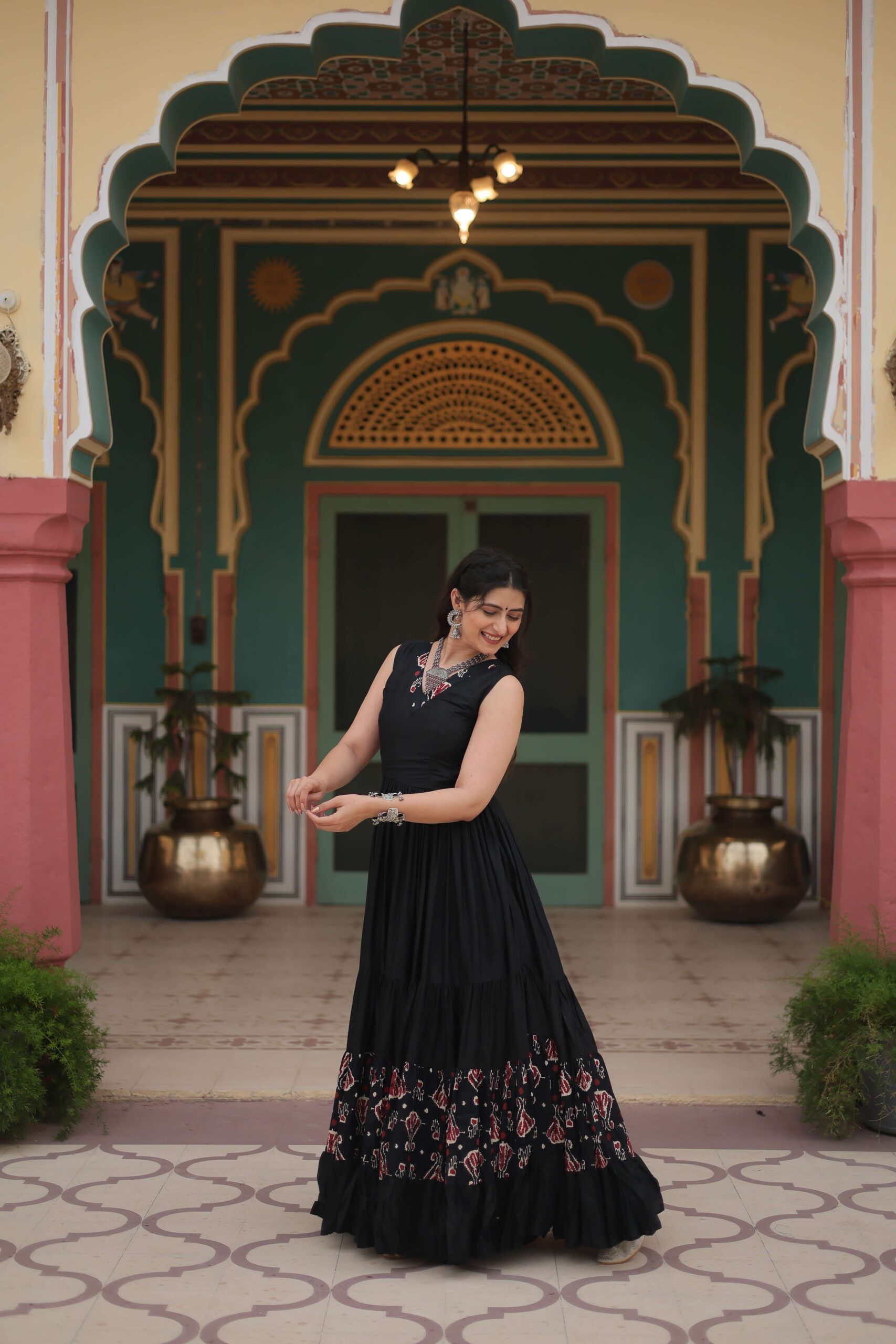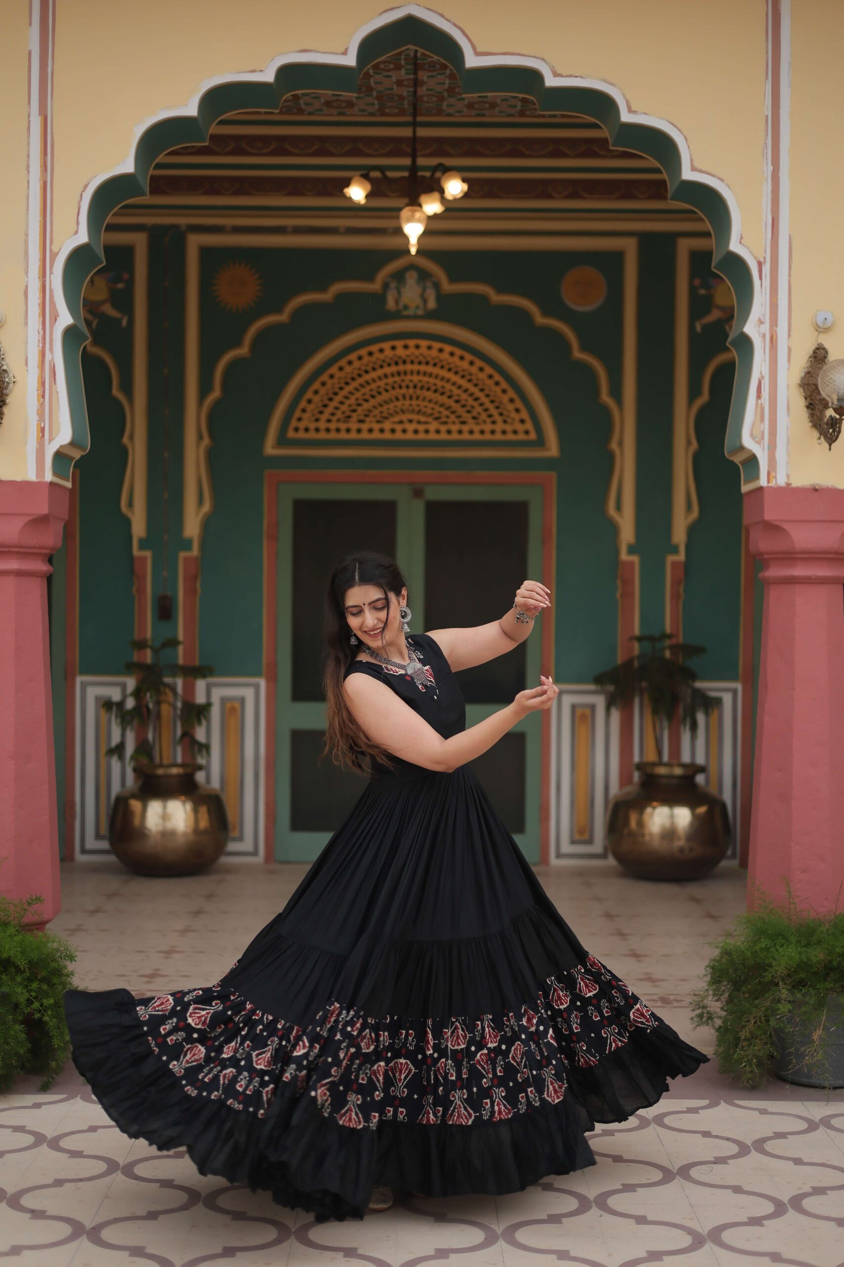 Step into Navratri with elegance in this stunning Reyon gown featuring layered frills, a flattering V-neck design, and a grand 12-meter flair. Perfect for festive garba nights and cultural celebrations.