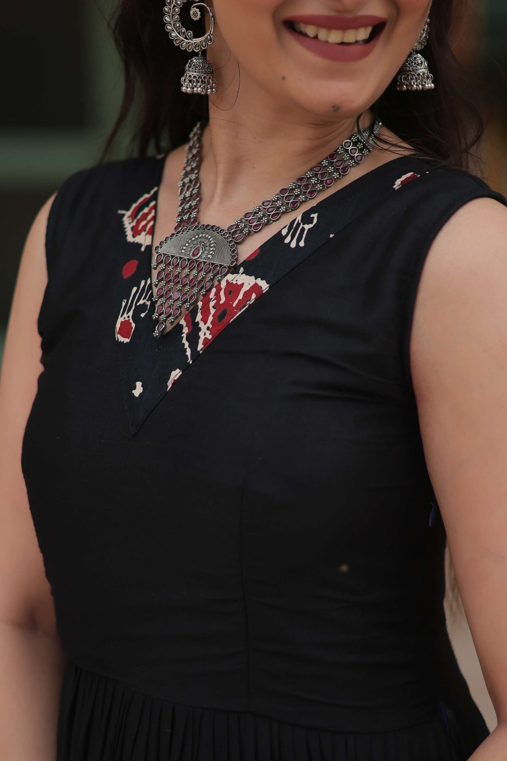 Black Designer Heavy Reyon Gown with Printed Frill & Fancy V-Neck