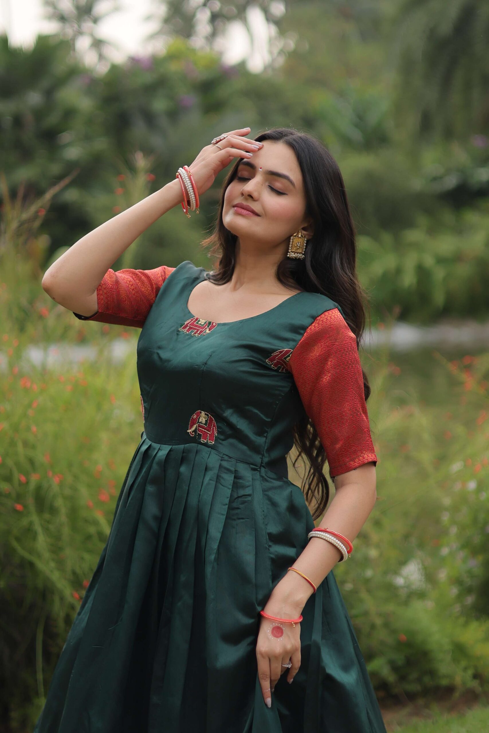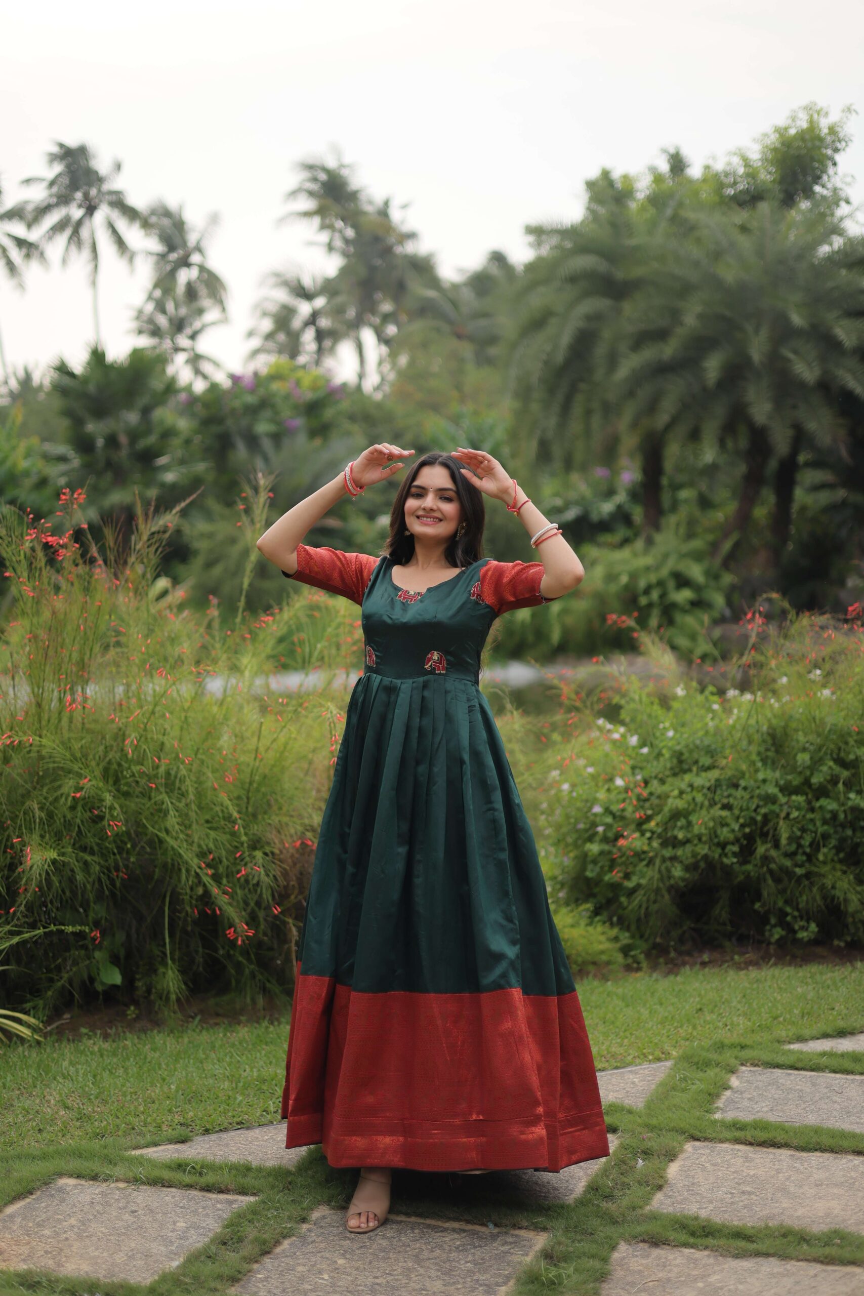 Green Banarasi Jacquard Silk Gown – Elegant Free-Size Designer Party & Wedding Wear