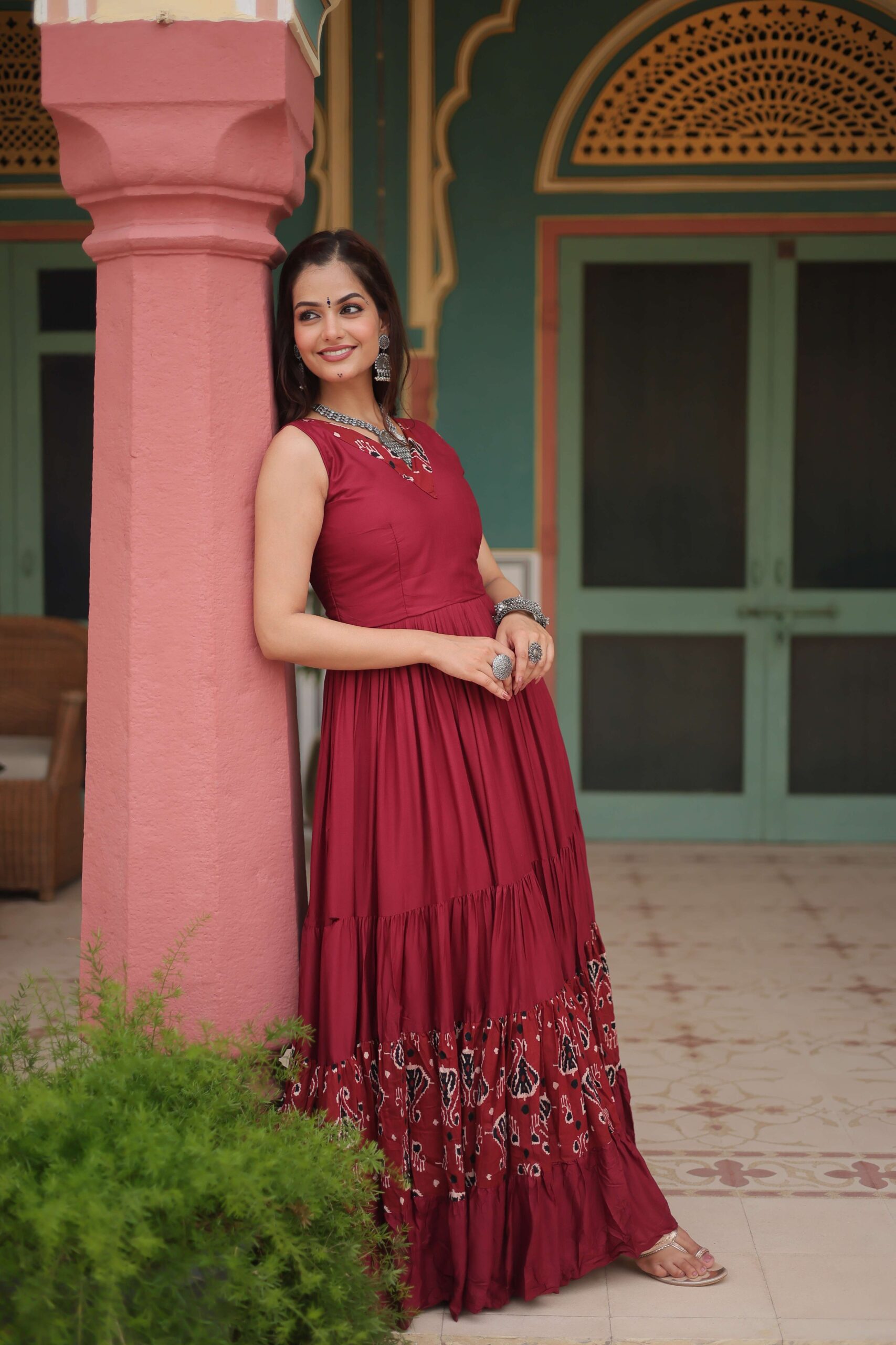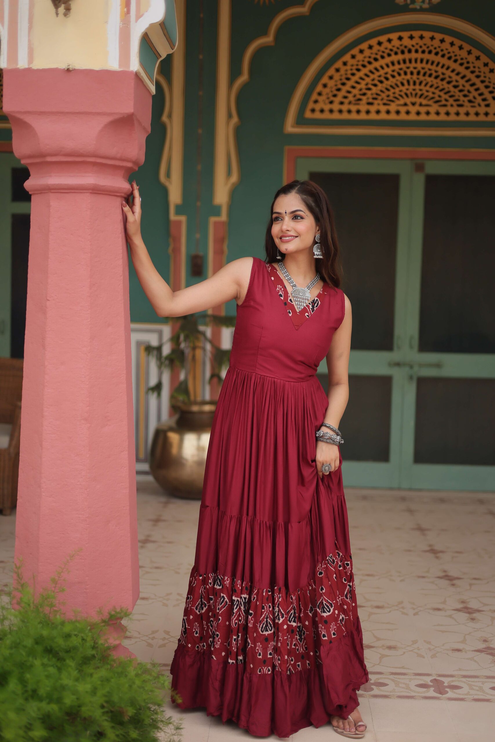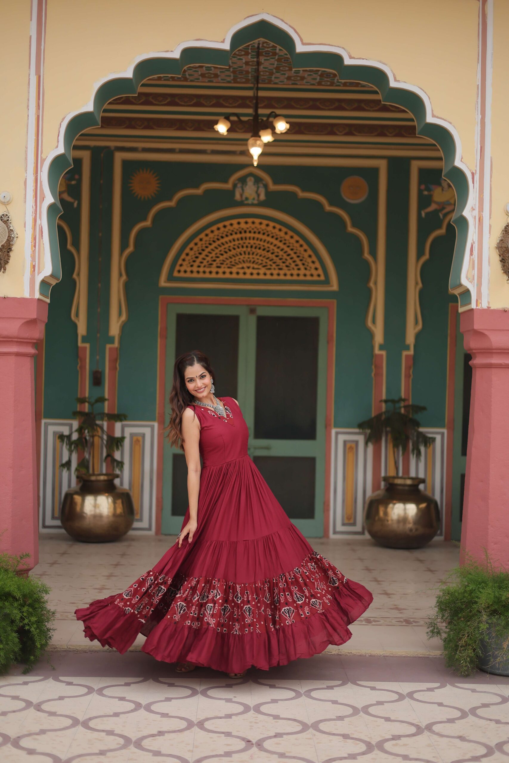 Step into Navratri with elegance in this stunning Reyon gown featuring layered frills, a flattering V-neck design, and a grand 12-meter flair. Perfect for festive garba nights and cultural celebrations.