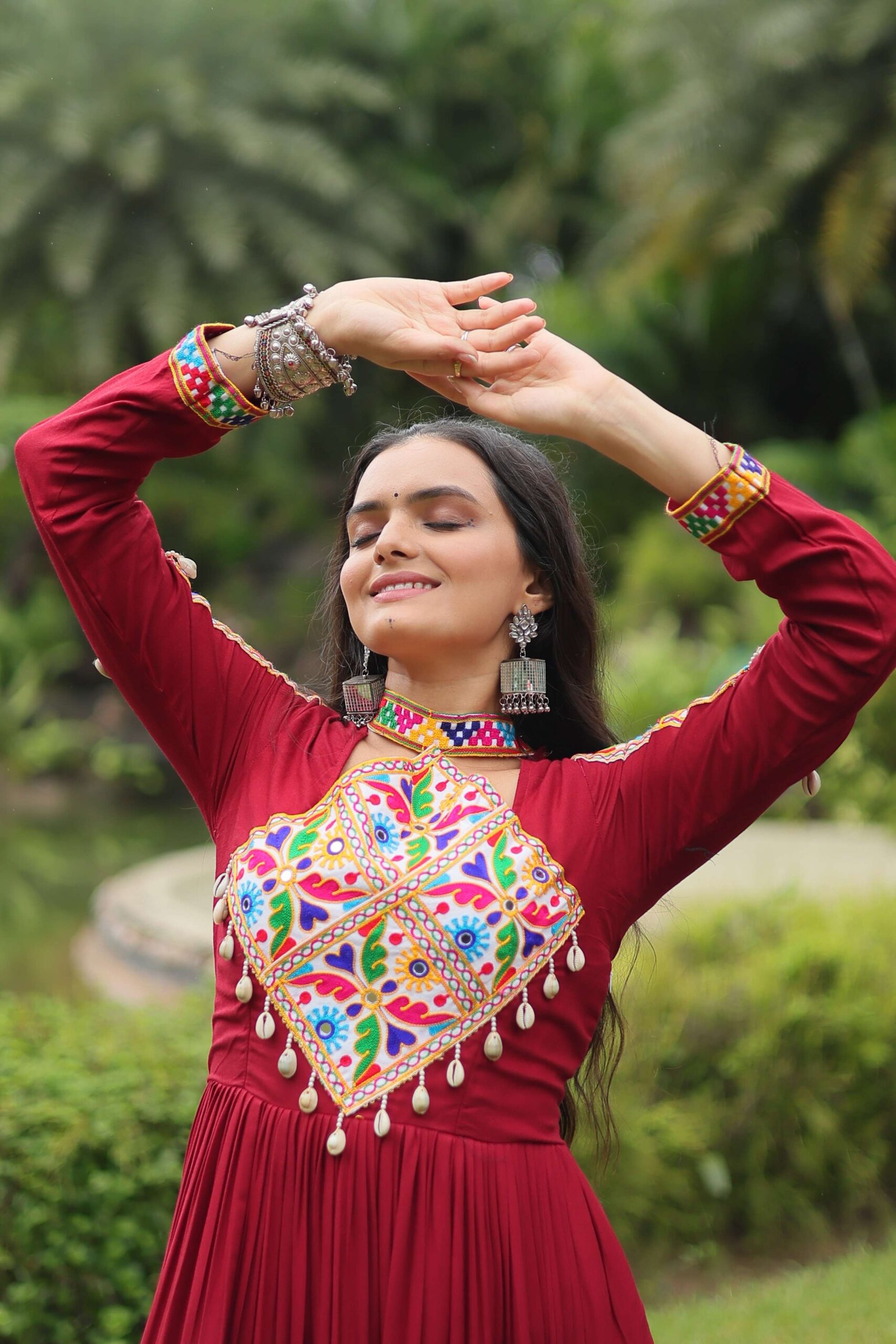 Maroon Reyon Partywear Gown with Kutchi Gamthi Work
