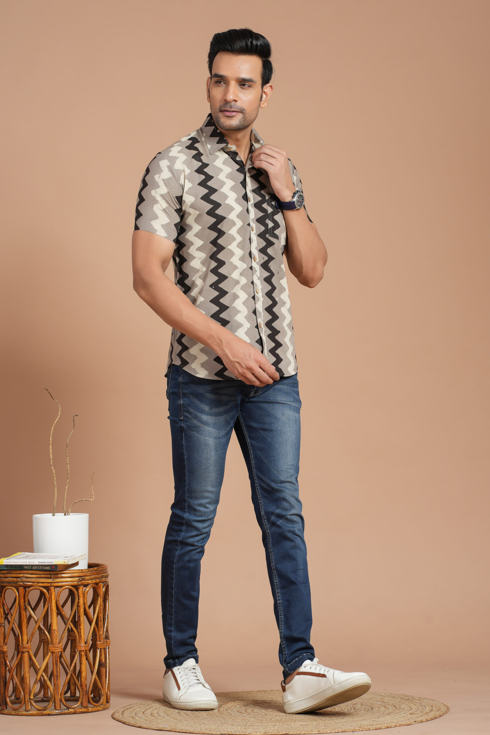 Men’s Printed Cotton Kurta – Crafted from soft cotton with a trendy mustard zig-zag print, this kurta features a mandarin collar, buttoned placket, and roll-up sleeves. Perfect for festive occasions, casual outings, and ethnic wear. Pair with black trousers or jeans for a smart, stylish look.