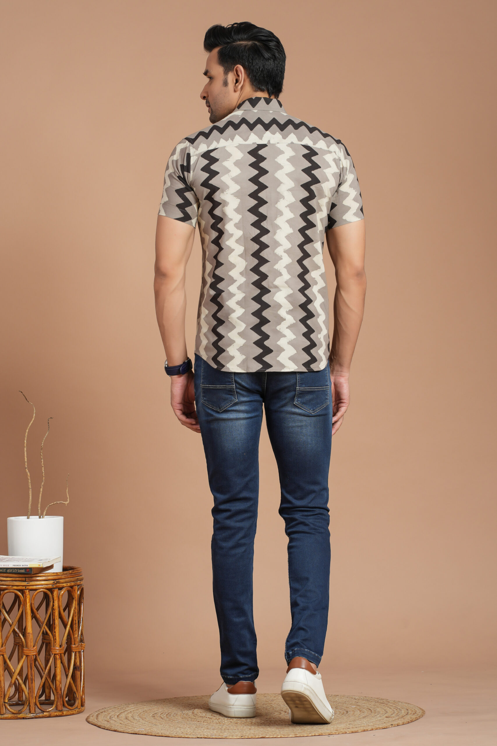 Be the first to review “Men’s Grey & Black Zigzag Printed Cotton Short-Sleeve Shirt – Casual Trendy Wear”
