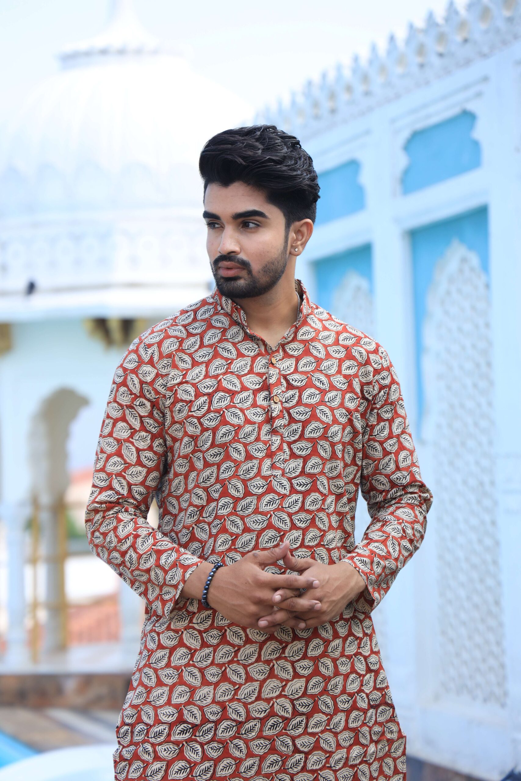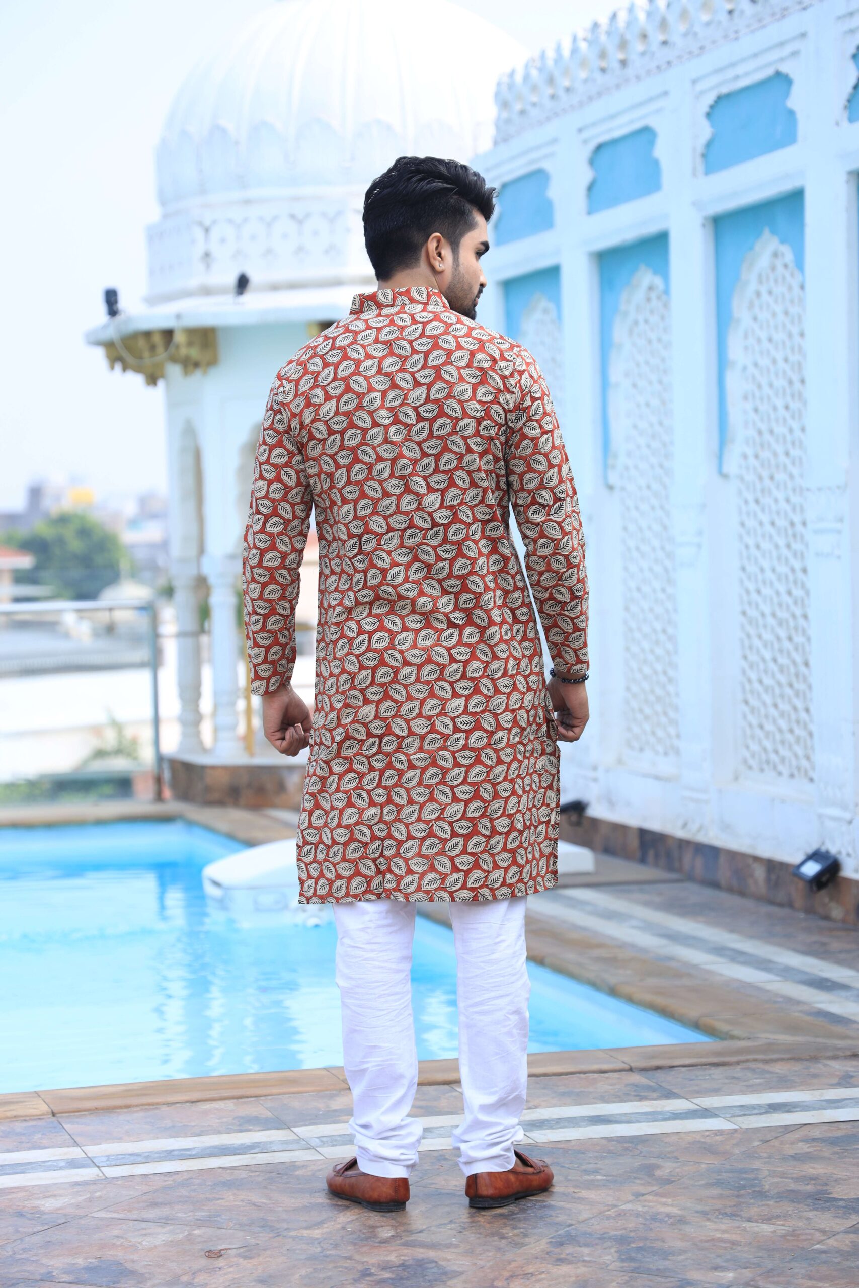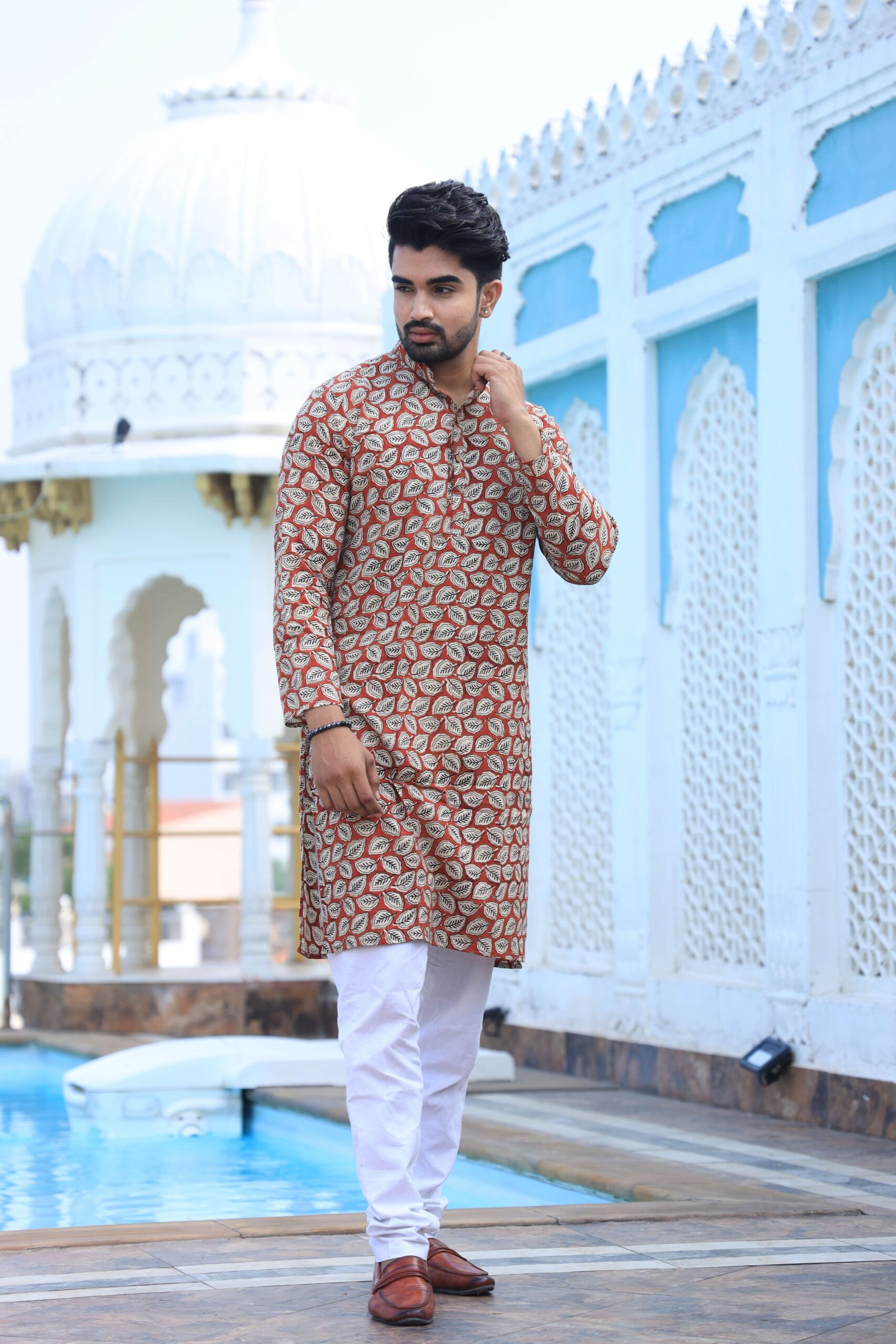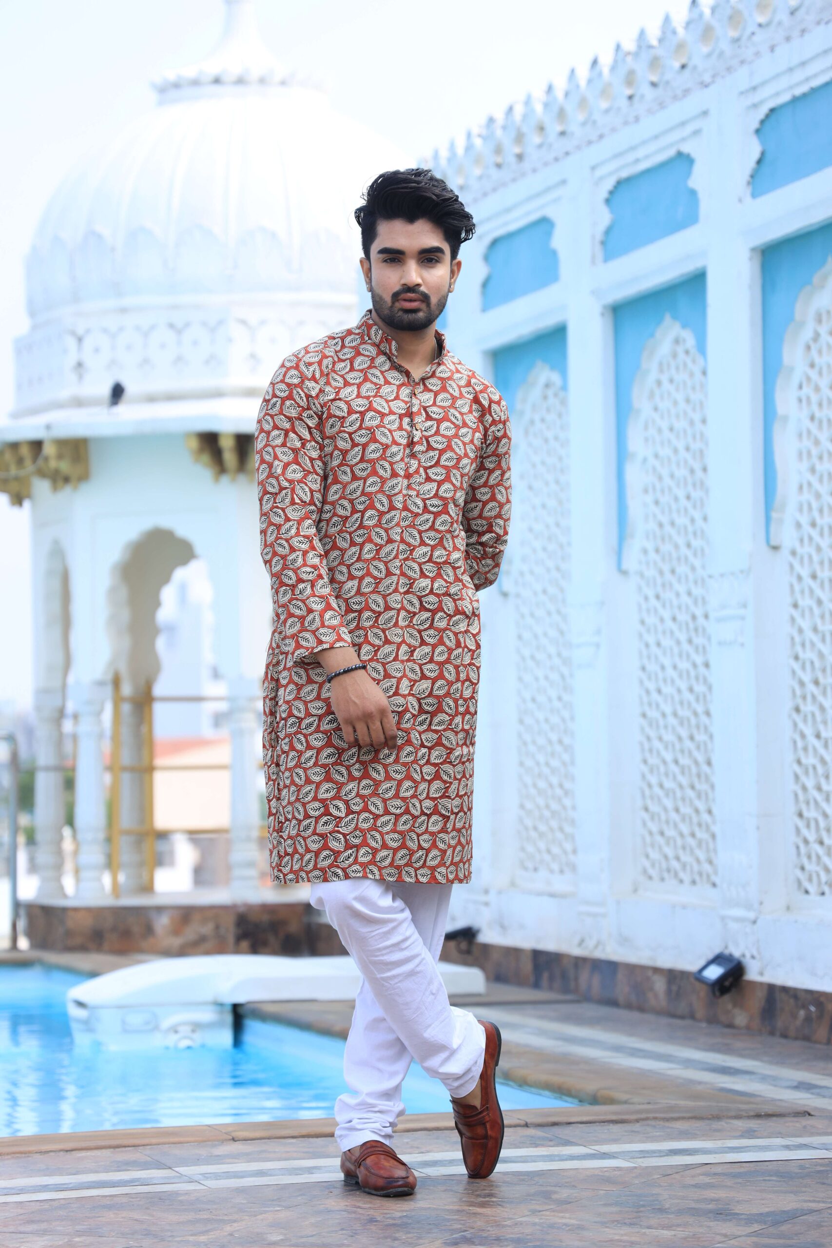 stylish Beige printed cotton kurta set for men, paired with classic white pajama pants. Designed with a comfortable fit and elegant detailing, this kurta is perfect for festivals, weddings, parties, pooja ceremonies, and cultural celebrations. The breathable cotton fabric ensures comfort, while the subtle printed motifs add a touch of sophistication. Pair it with leather sandals or juttis to complete your traditional look.