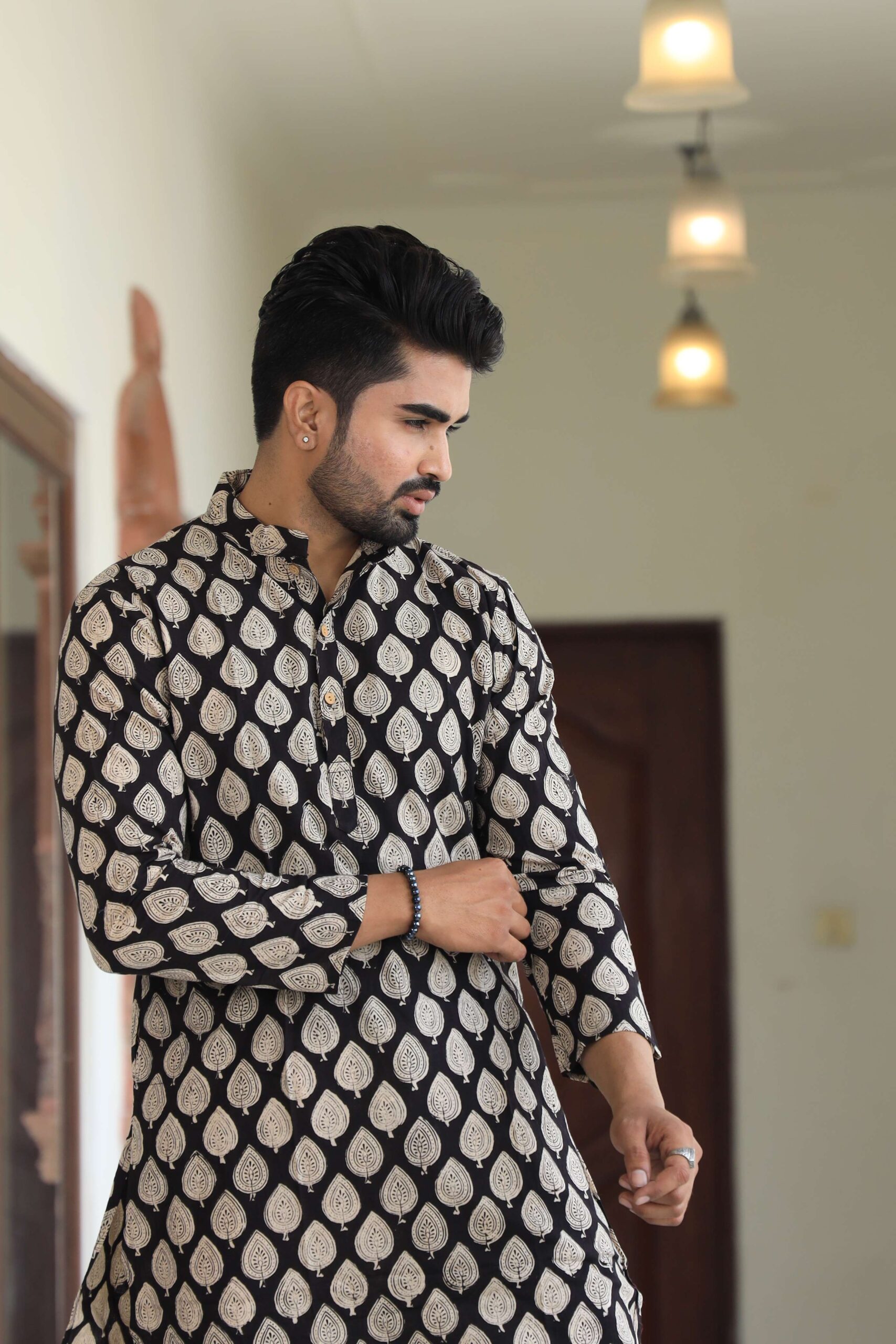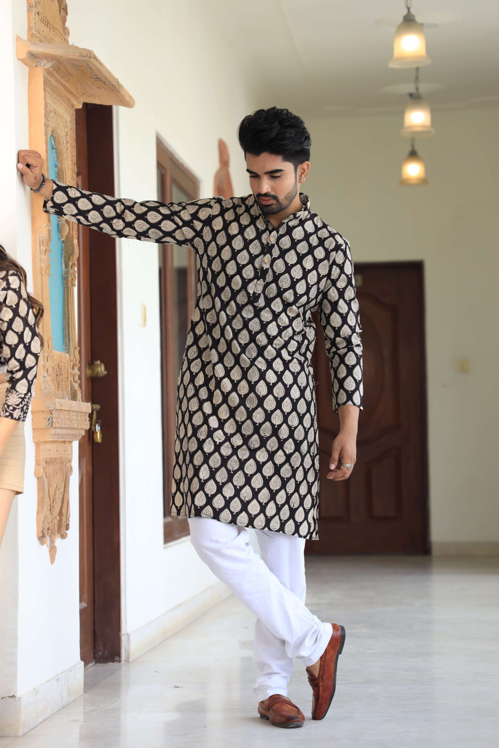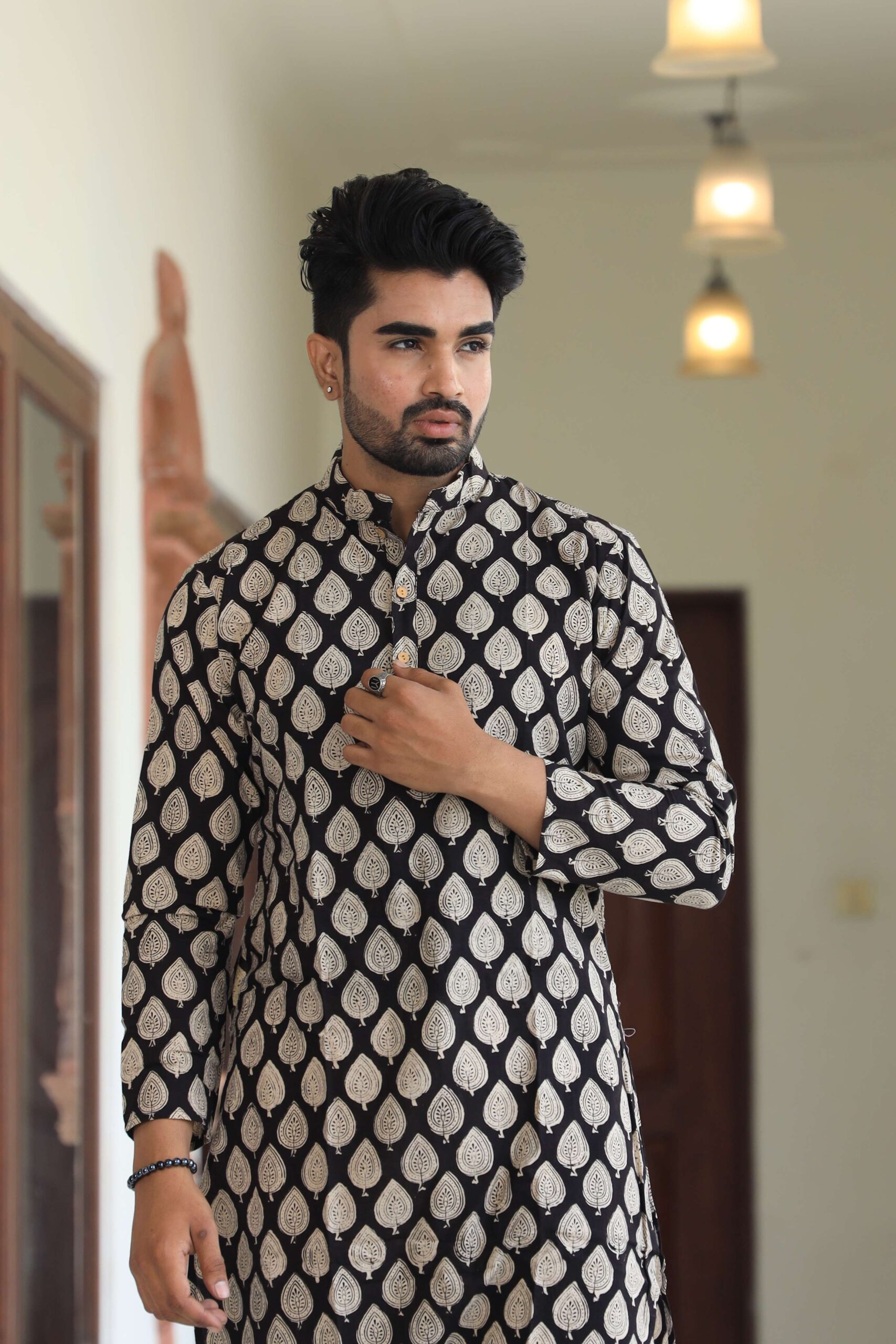 stylish Black Leaf printed cotton kurta set for men, paired Black Leaf with classic white pajama pants. Designed with a comfortable fit and elegant detailing, this kurta is perfect for festivals, weddings, parties, pooja ceremonies, and cultural celebrations. The breathable cotton fabric ensures comfort, while the subtle printed motifs add a touch of sophistication. Pair it with leather sandals or juttis to complete your traditional look.