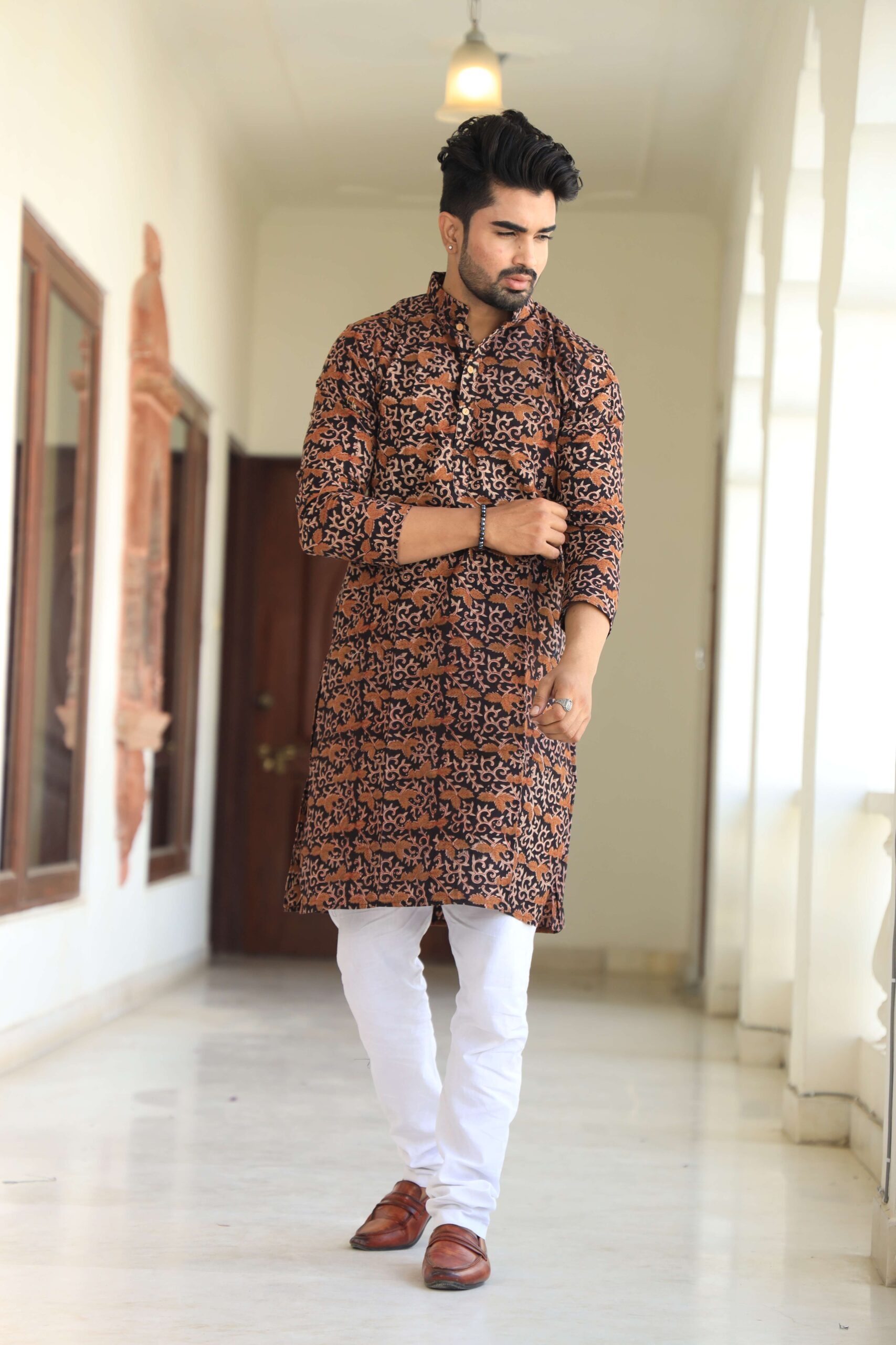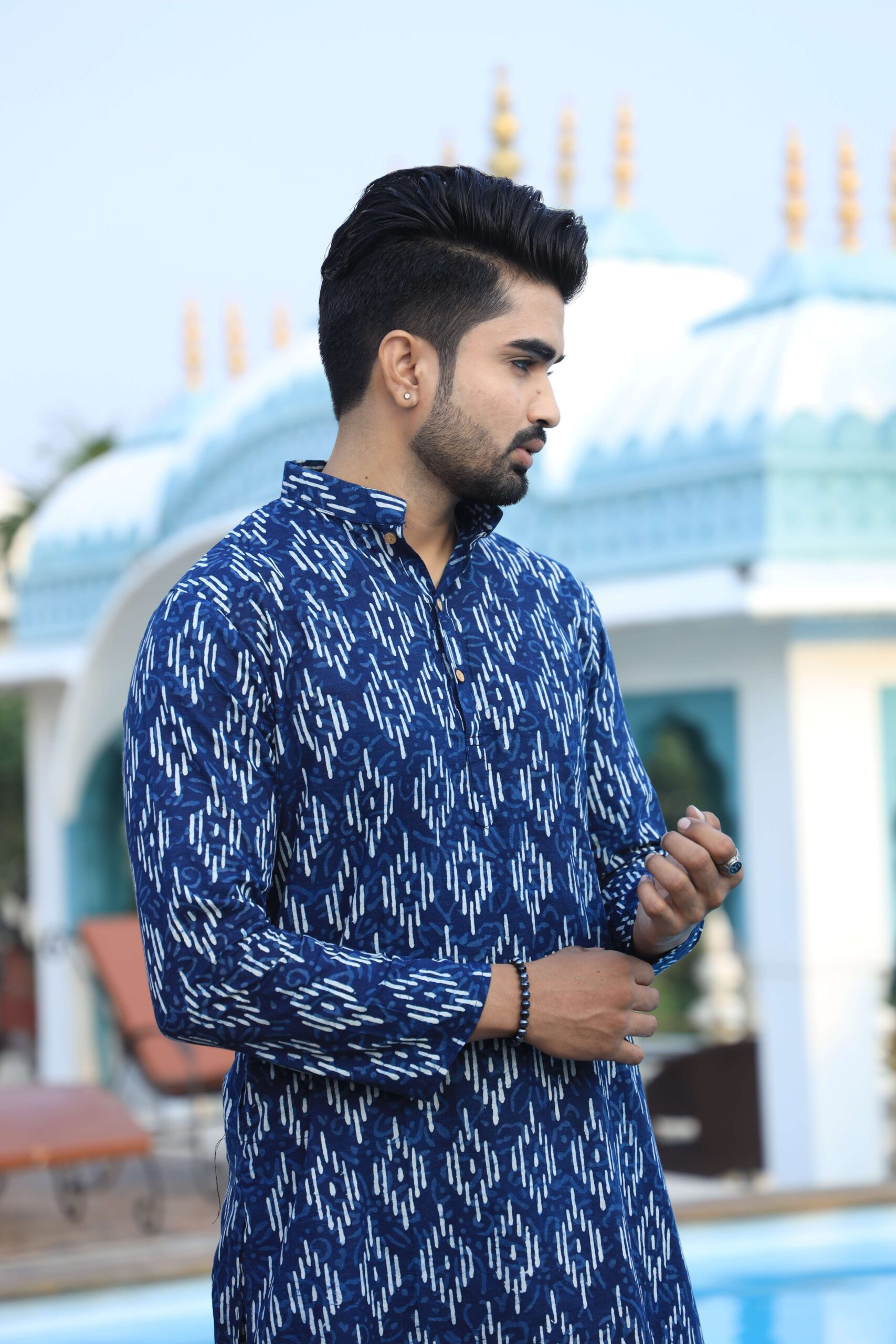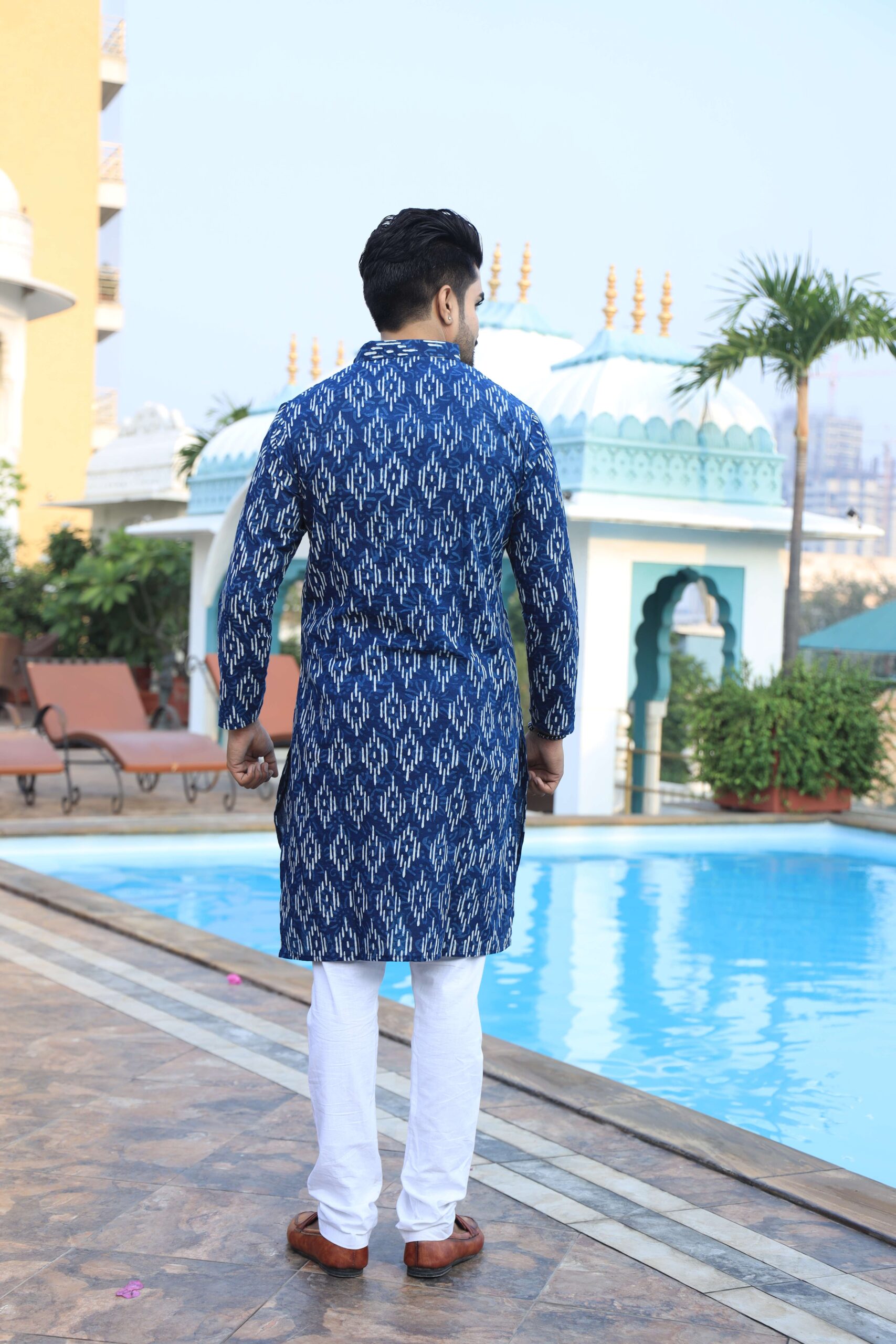 stylish Blue printed cotton kurta set for men, paired with classic white pajama pants. Designed with a comfortable fit and elegant detailing, this kurta is perfect for festivals, weddings, parties, pooja ceremonies, and cultural celebrations. The breathable cotton fabric ensures comfort, while the subtle printed motifs add a touch of sophistication. Pair it with leather sandals or juttis to complete your traditional look.