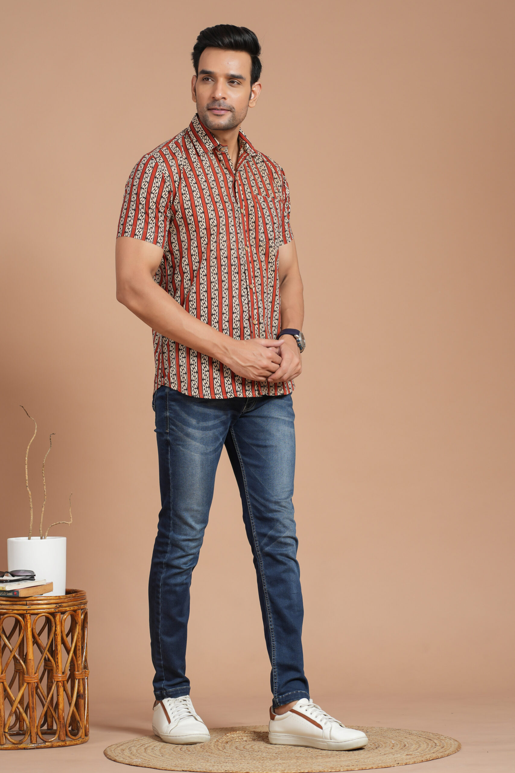 Men’s Printed Cotton Kurta – Crafted from soft cotton with a trendy mustard zig-zag print, this kurta features a mandarin collar, buttoned placket, and roll-up sleeves. Perfect for festive occasions, casual outings, and ethnic wear. Pair with black trousers or jeans for a smart, stylish look.
