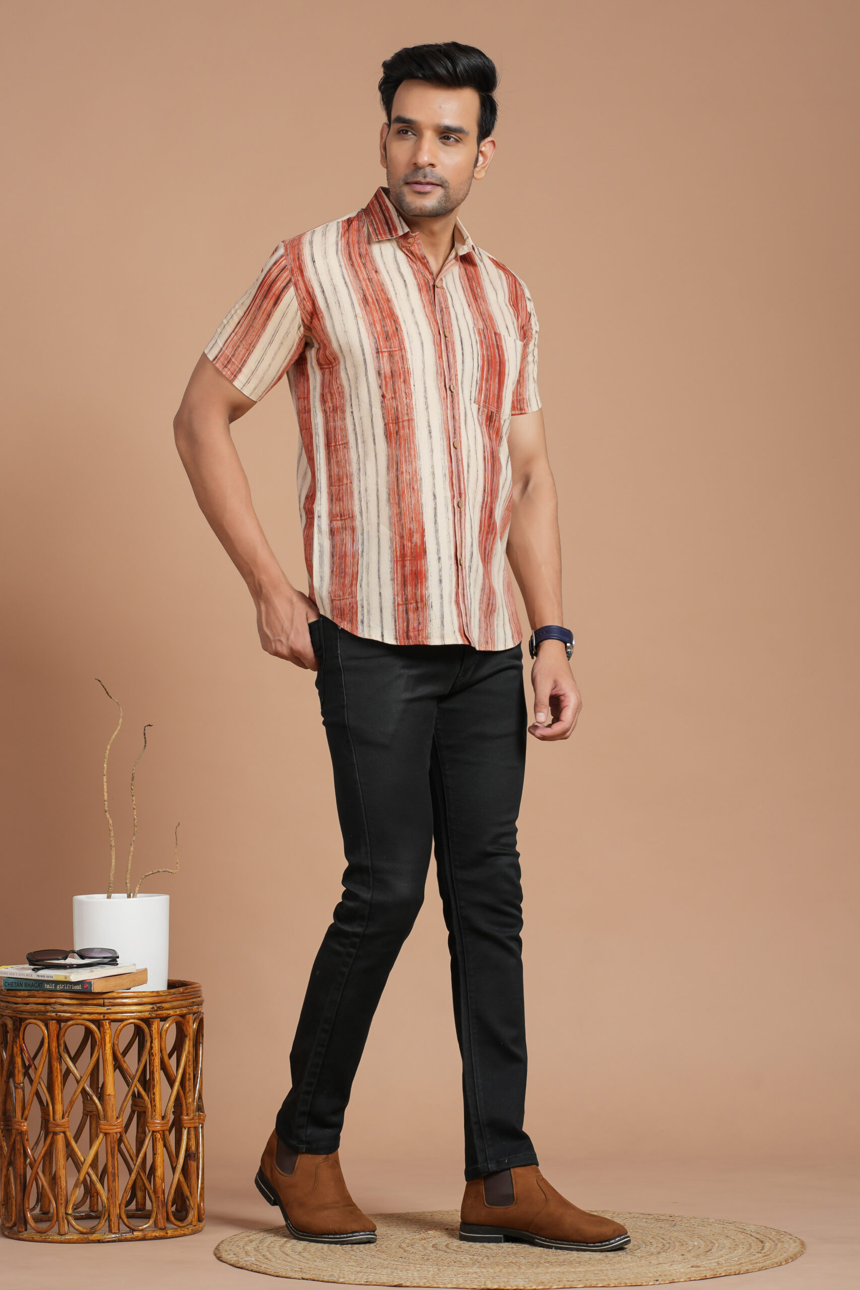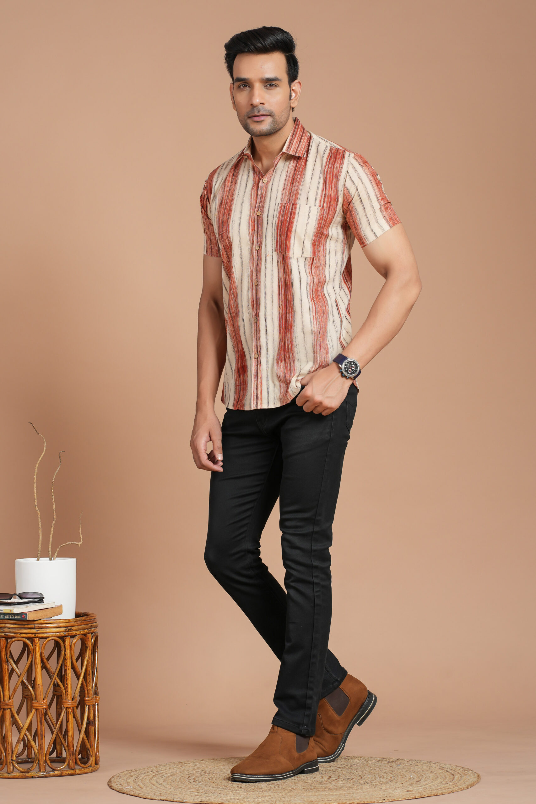 Be the first to review “Men’s Cotton Beige & Rust Striped Short-Sleeve Shirt – Casual Summer Wear”