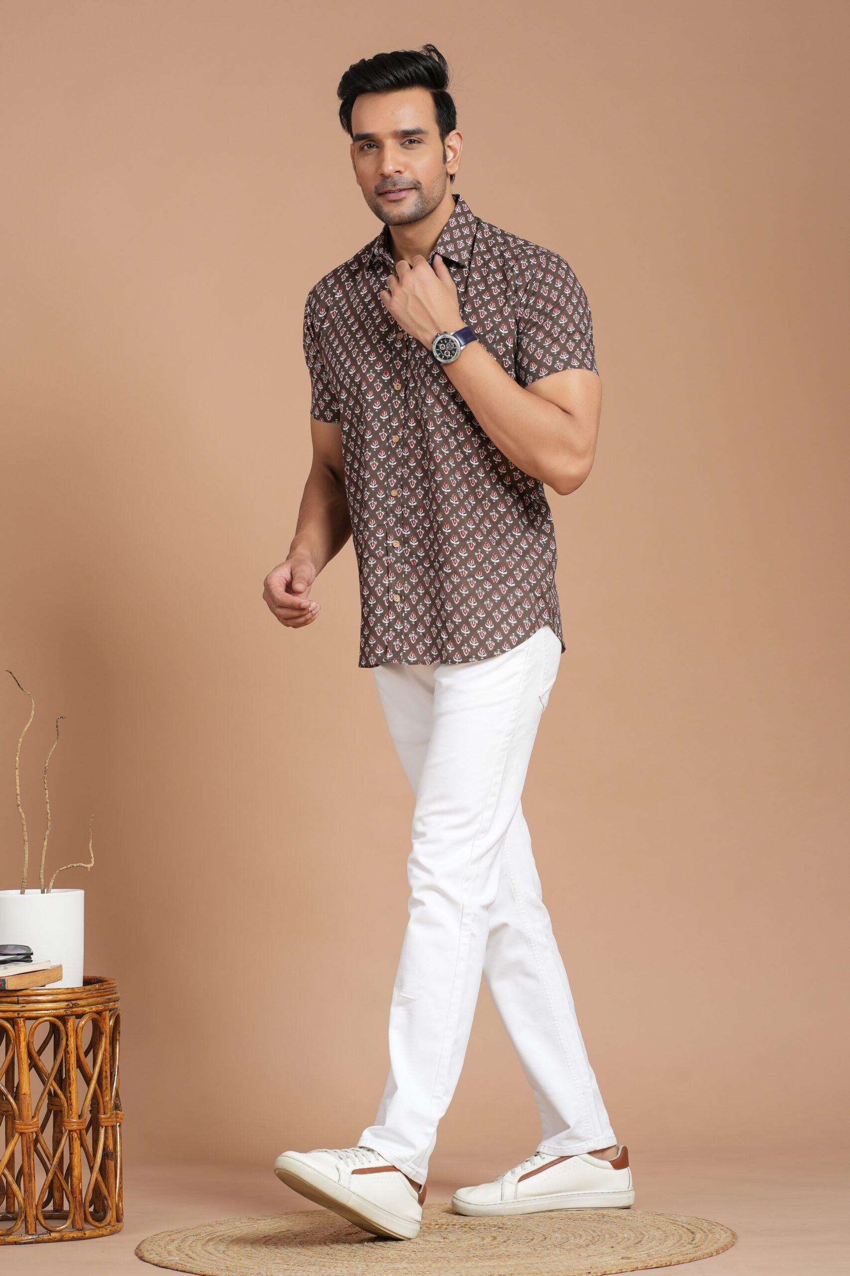 Men's Cotton Brown Printed Short-Sleeve Shirt Β– Casual & Daily Summer Wear
