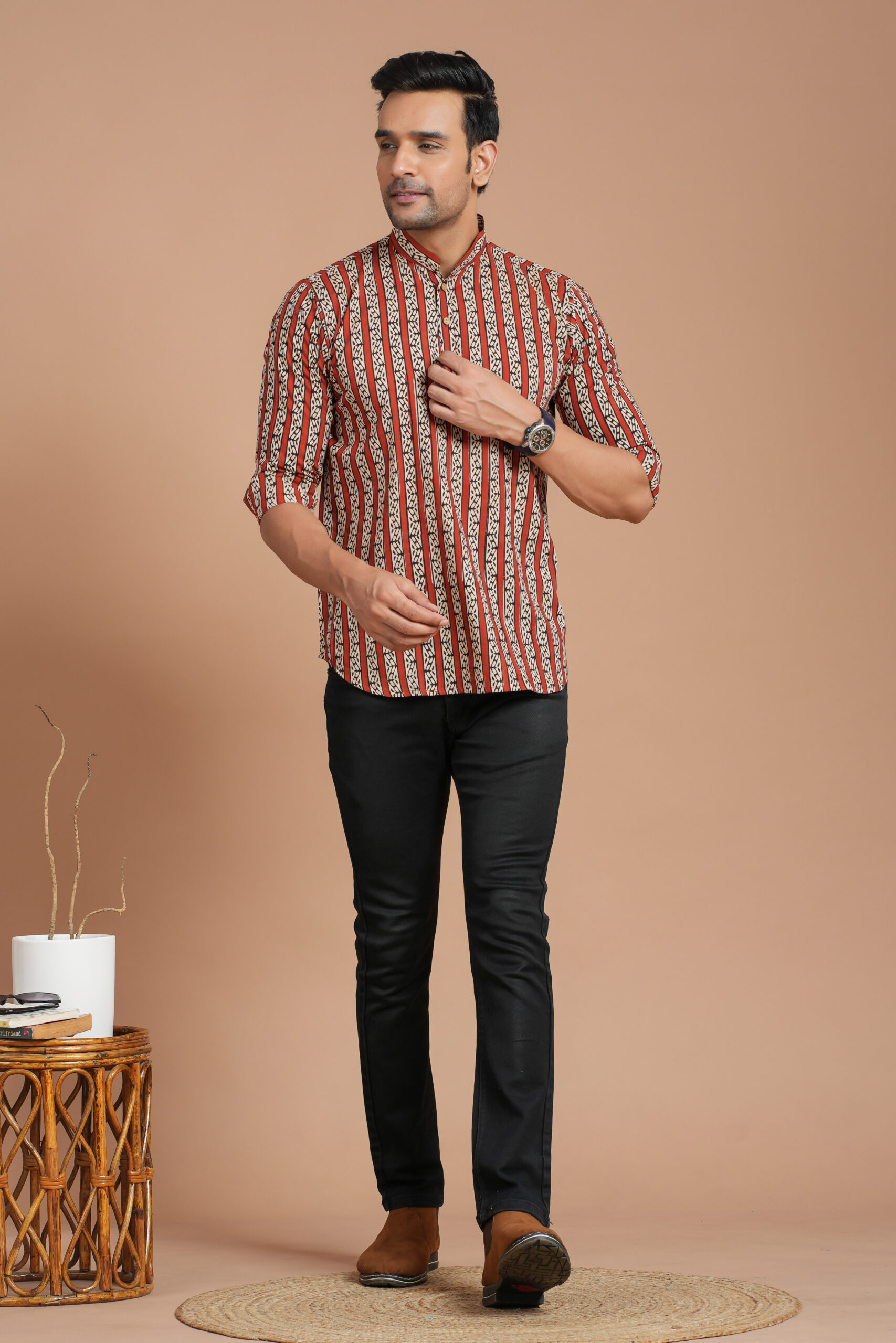 MenΒ’s Printed Cotton Kurta Β– Crafted from soft cotton with a trendy mustard zig-zag print, this kurta features a mandarin collar, buttoned placket, and roll-up sleeves. Perfect for festive occasions, casual outings, and ethnic wear. Pair with black trousers or jeans for a smart, stylish look.