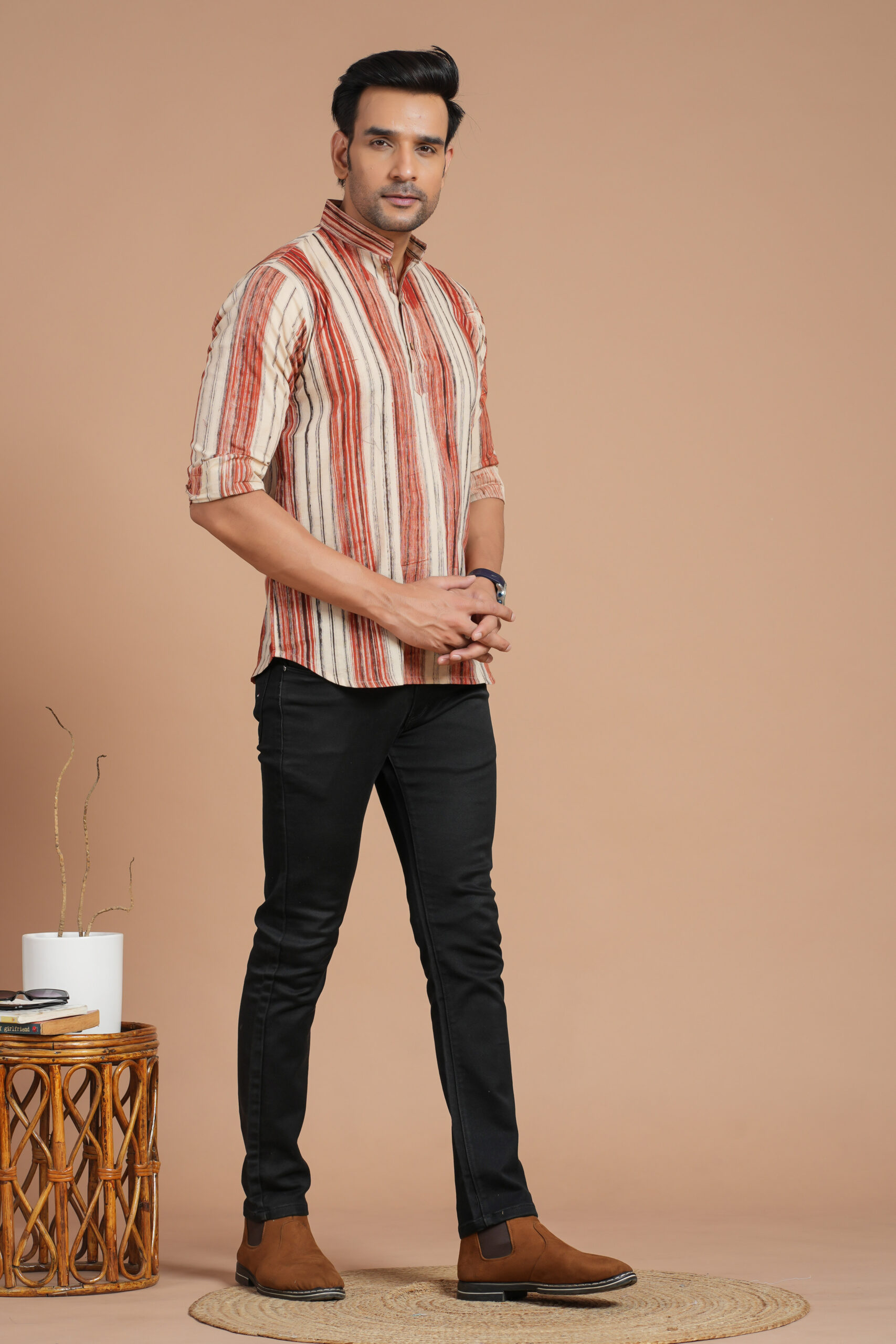 Men's Cotton Red & Beige Striped Casual Kurta – Daily & Festive Wear