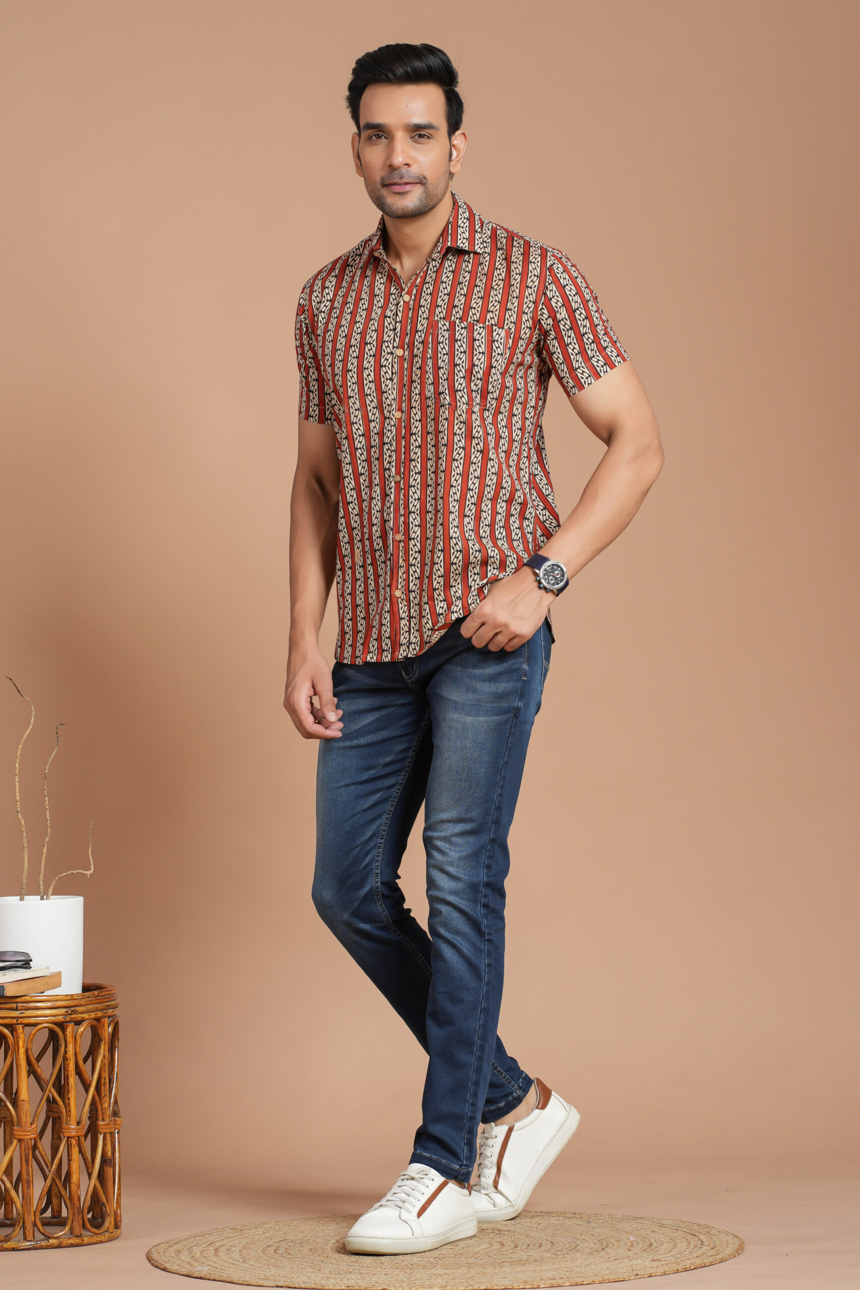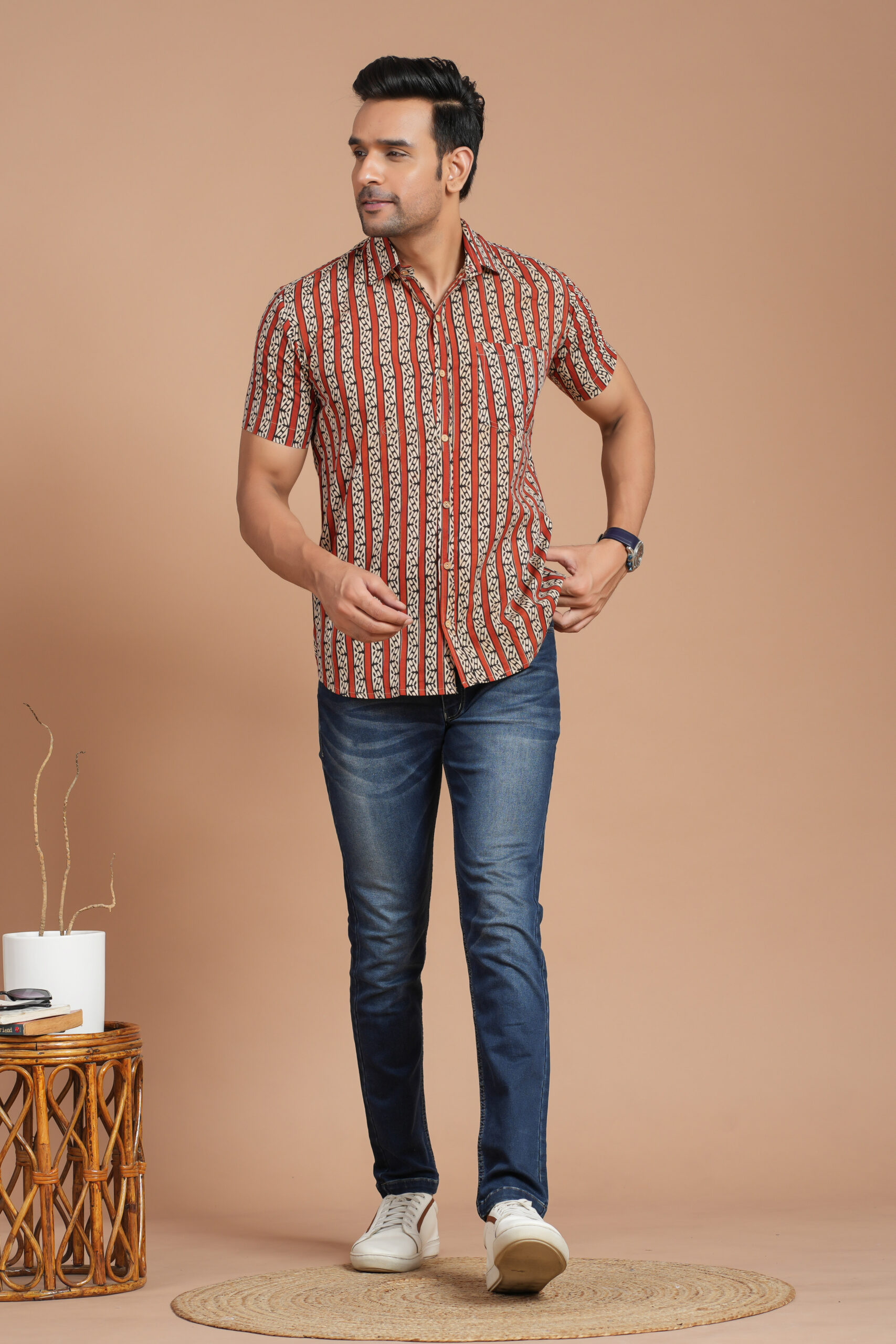 Men's Cotton Rust Red Striped Printed Short-Sleeve Shirt – Casual Summer Wear