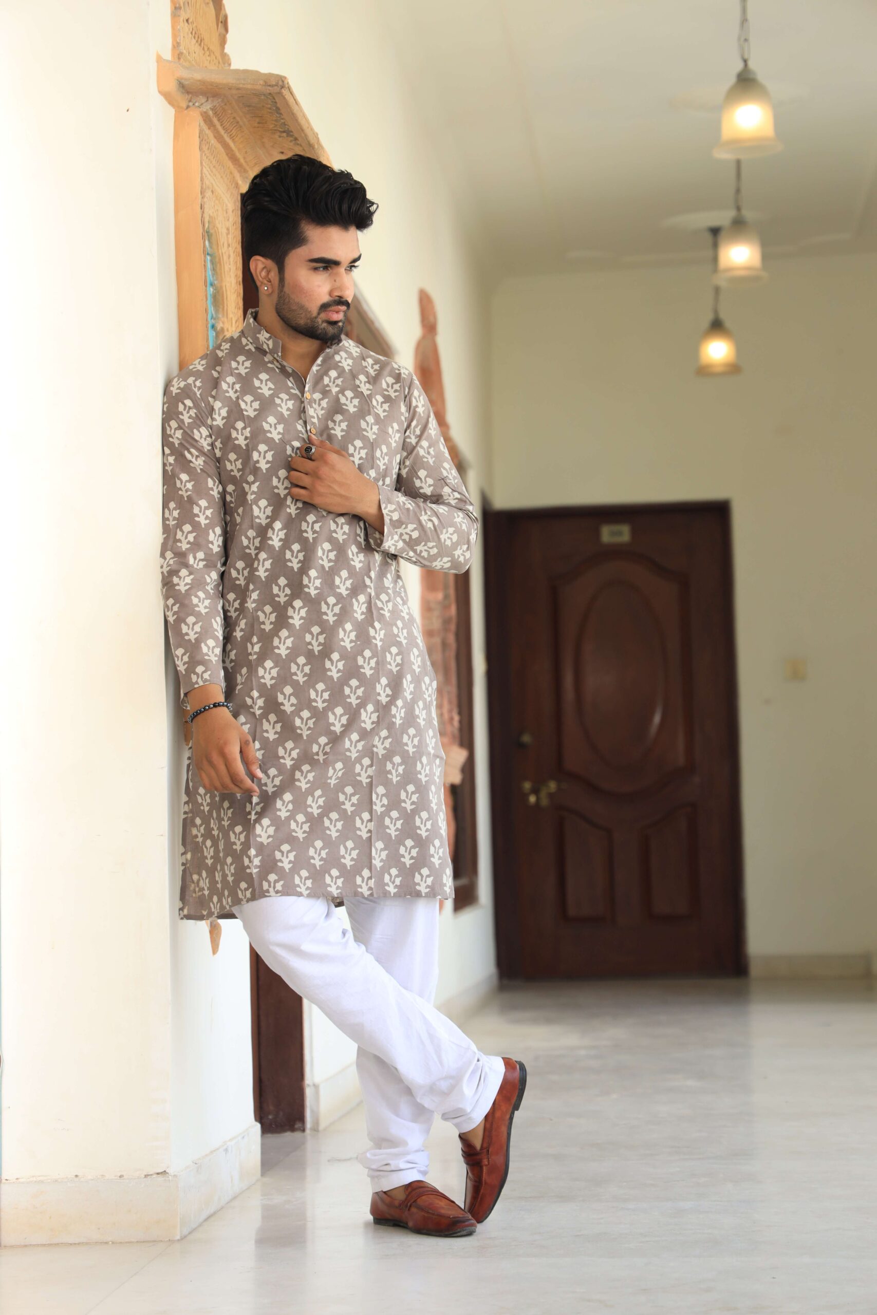 stylish grey printed cotton kurta set for men, paired grey Striped with classic white pajama pants. Designed with a comfortable fit and elegant detailing, this kurta is perfect for festivals, weddings, parties, pooja ceremonies, and cultural celebrations. The breathable cotton fabric ensures comfort, while the subtle printed motifs add a touch of sophistication. Pair it with leather sandals or juttis to complete your traditional look.