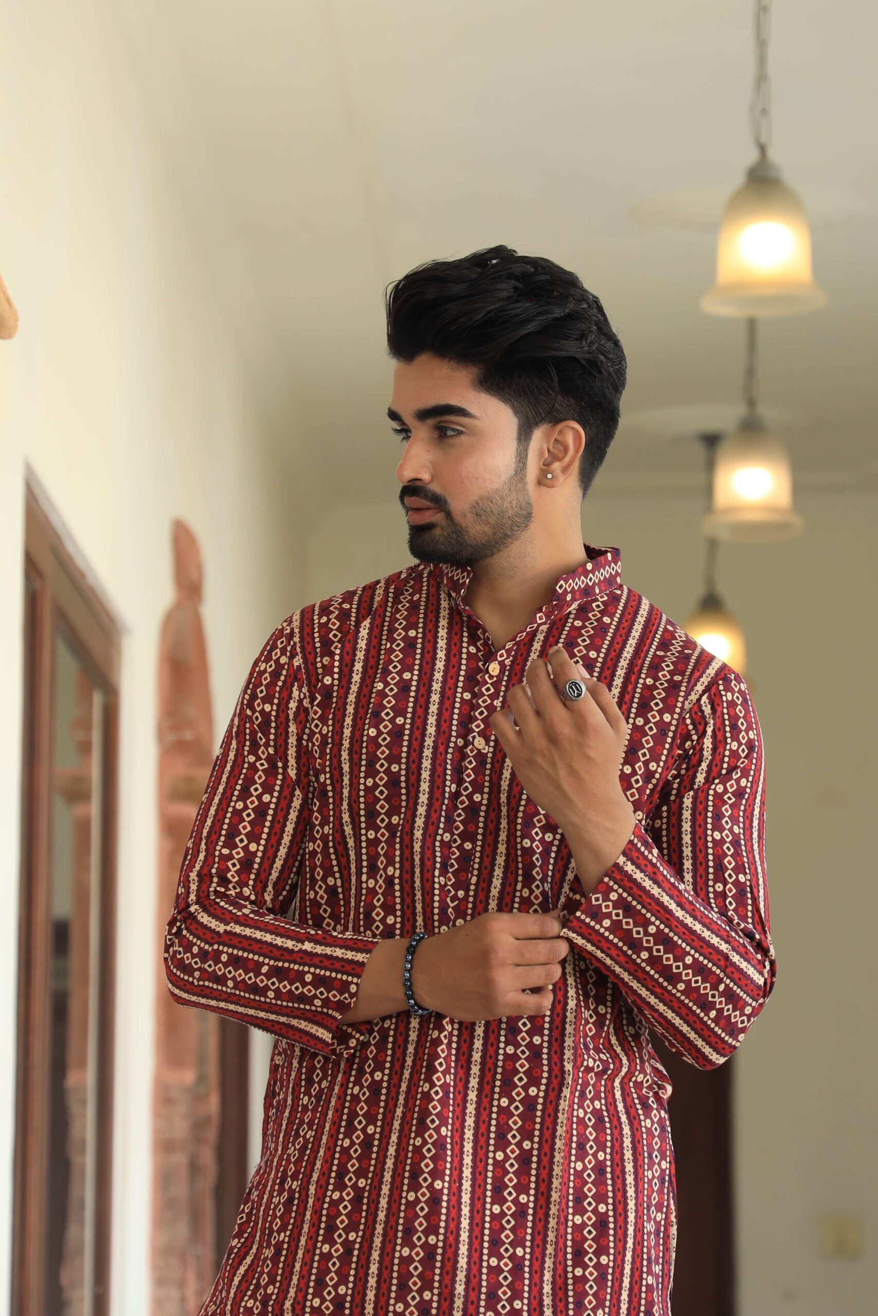 stylish Maroon Striped printed cotton kurta set for men, paired Maroon Striped with classic white pajama pants. Designed with a comfortable fit and elegant detailing, this kurta is perfect for festivals, weddings, parties, pooja ceremonies, and cultural celebrations. The breathable cotton fabric ensures comfort, while the subtle printed motifs add a touch of sophistication. Pair it with leather sandals or juttis to complete your traditional look.