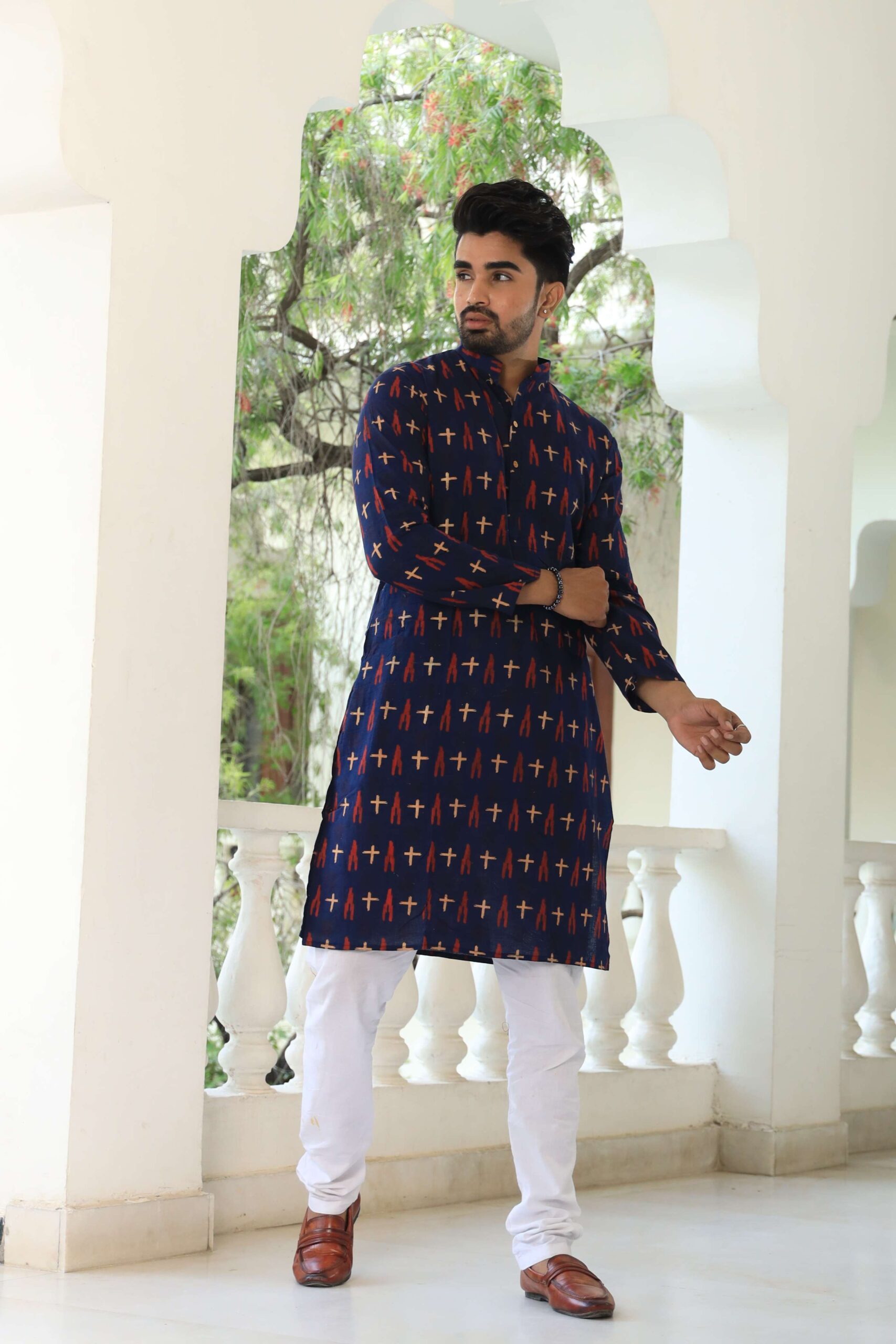 stylish navy blue printed cotton kurta set for men, paired with classic white pajama pants. Designed with a comfortable fit and elegant detailing, this kurta is perfect for festivals, weddings, parties, pooja ceremonies, and cultural celebrations. The breathable cotton fabric ensures comfort, while the subtle printed motifs add a touch of sophistication. Pair it with leather sandals or juttis to complete your traditional look.