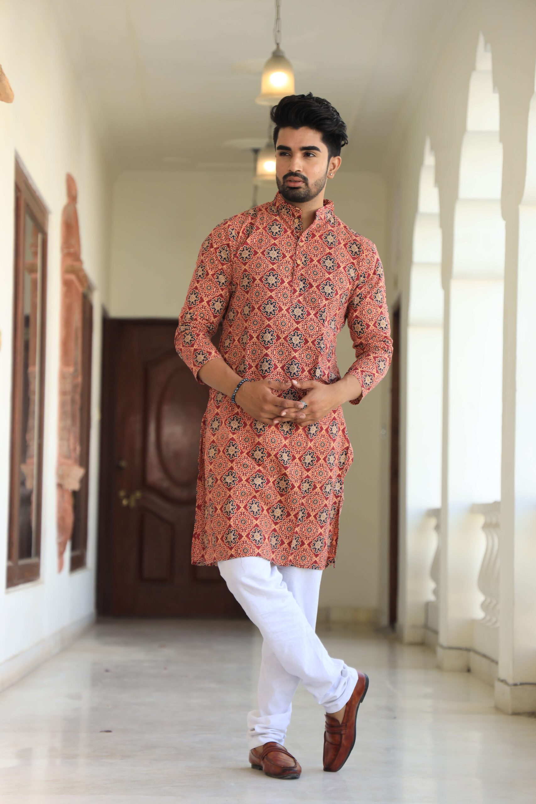stylish Red printed cotton kurta set for men, paired Red with classic white pajama pants. Designed with a comfortable fit and elegant detailing, this kurta is perfect for festivals, weddings, parties, pooja ceremonies, and cultural celebrations. The breathable cotton fabric ensures comfort, while the subtle printed motifs add a touch of sophistication. Pair it with leather sandals or juttis to complete your traditional look.
