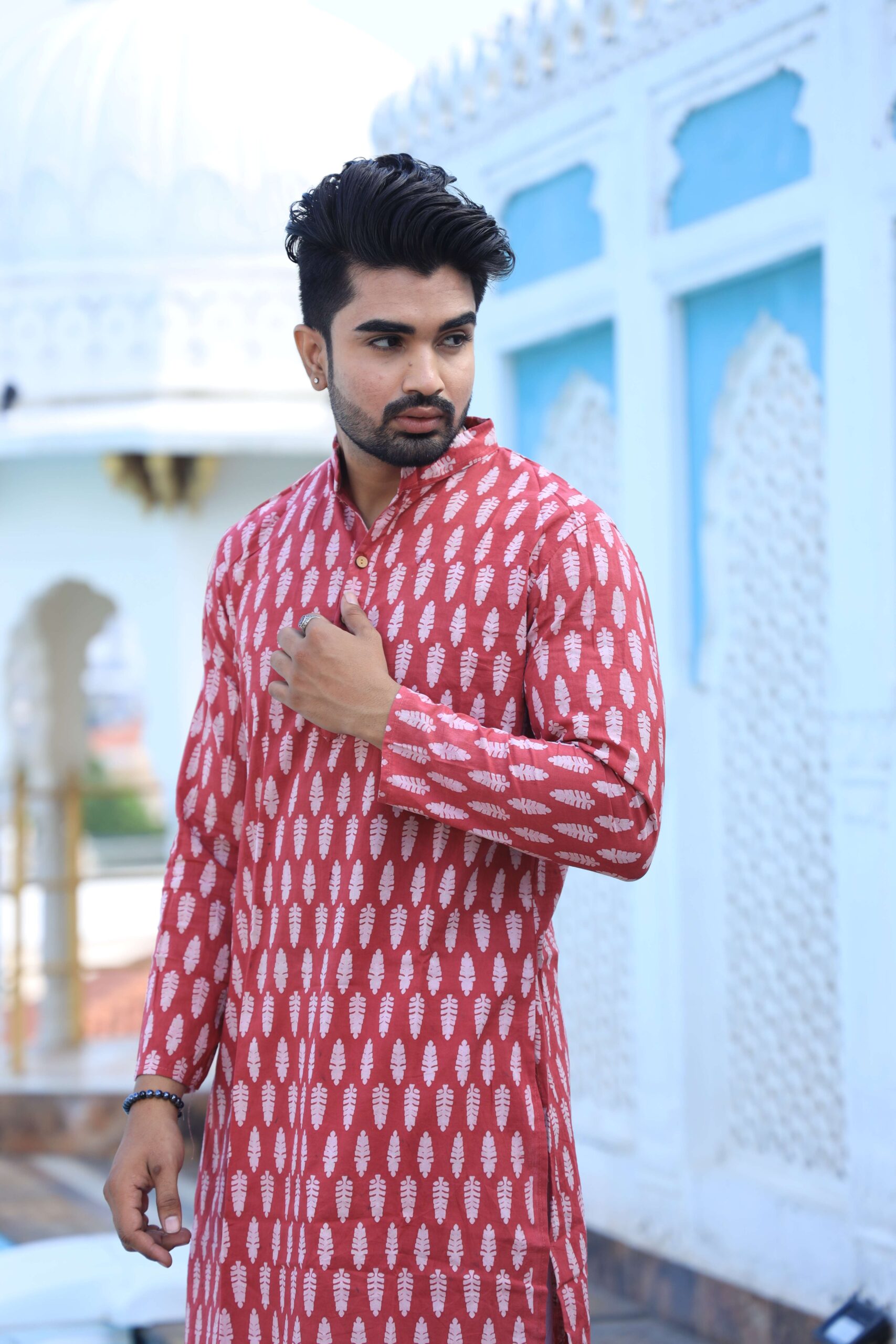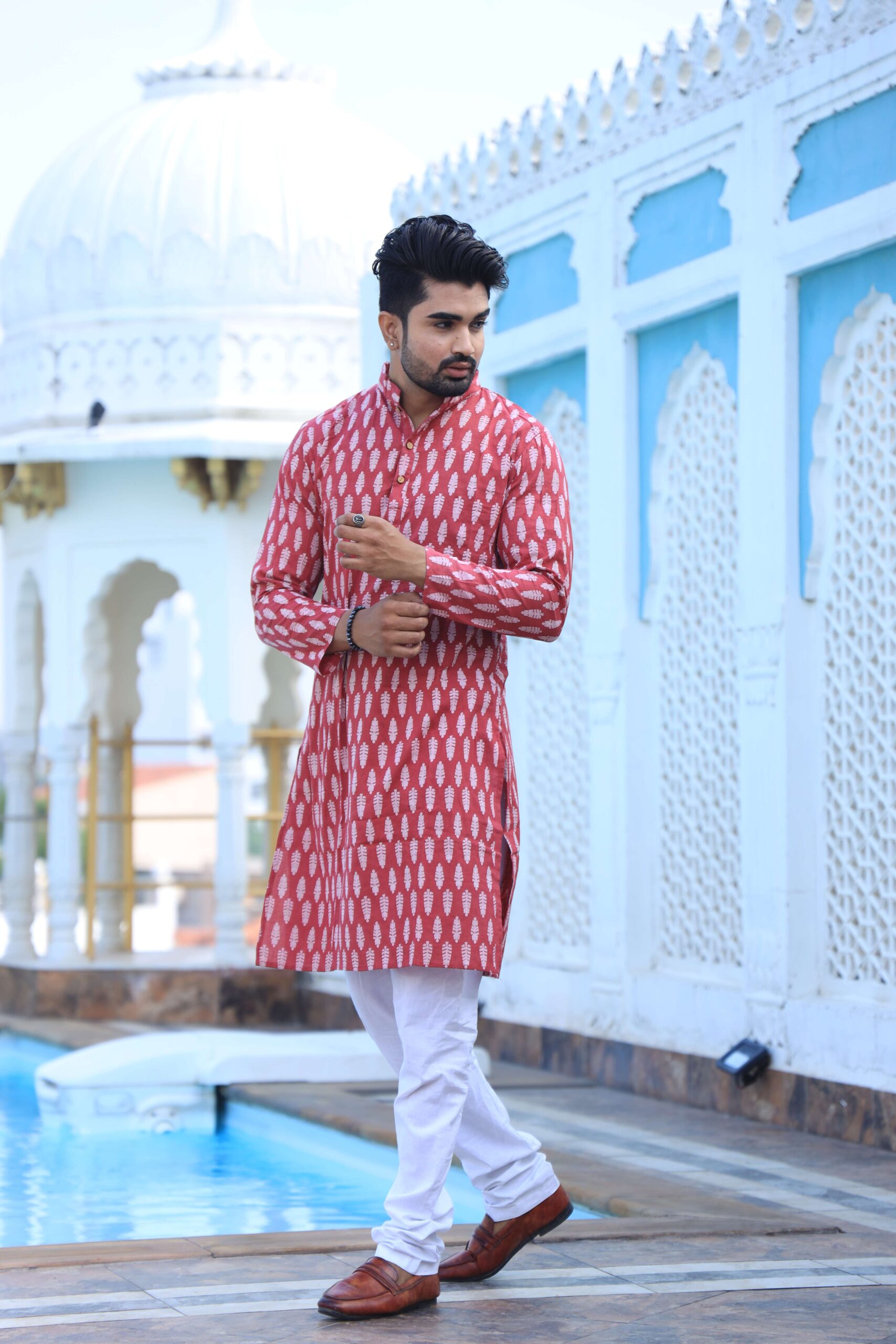 stylish Red printed cotton kurta set for men, paired with classic white pajama pants. Designed with a comfortable fit and elegant detailing, this kurta is perfect for festivals, weddings, parties, pooja ceremonies, and cultural celebrations. The breathable cotton fabric ensures comfort, while the subtle printed motifs add a touch of sophistication. Pair it with leather sandals or juttis to complete your traditional look.