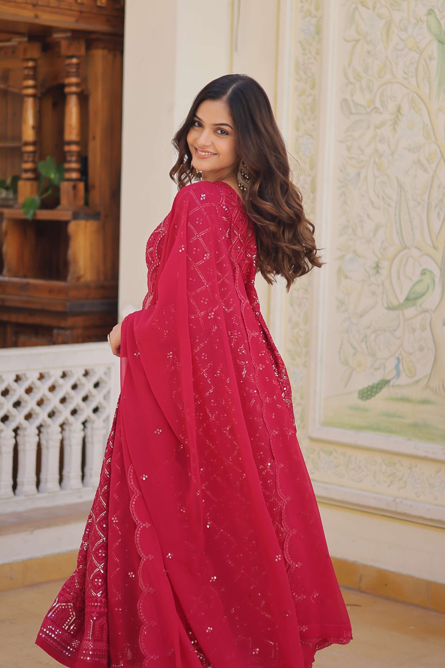 Step into sophistication with this premium Faux Georgette gown-dupatta set. Crafted from high-quality Faux Georgette fabric, the gown is adorned with intricate embroidery and multi-sequins detailing, featuring a round neck, full sleeves, and a 12-meter flowing flair with three-layer frill stitching.