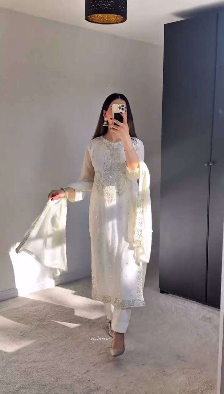 Women's Georgette Embroidery Sequence Work with Rivet Moti Work Straight Kurti With Pant and Dupatta Set