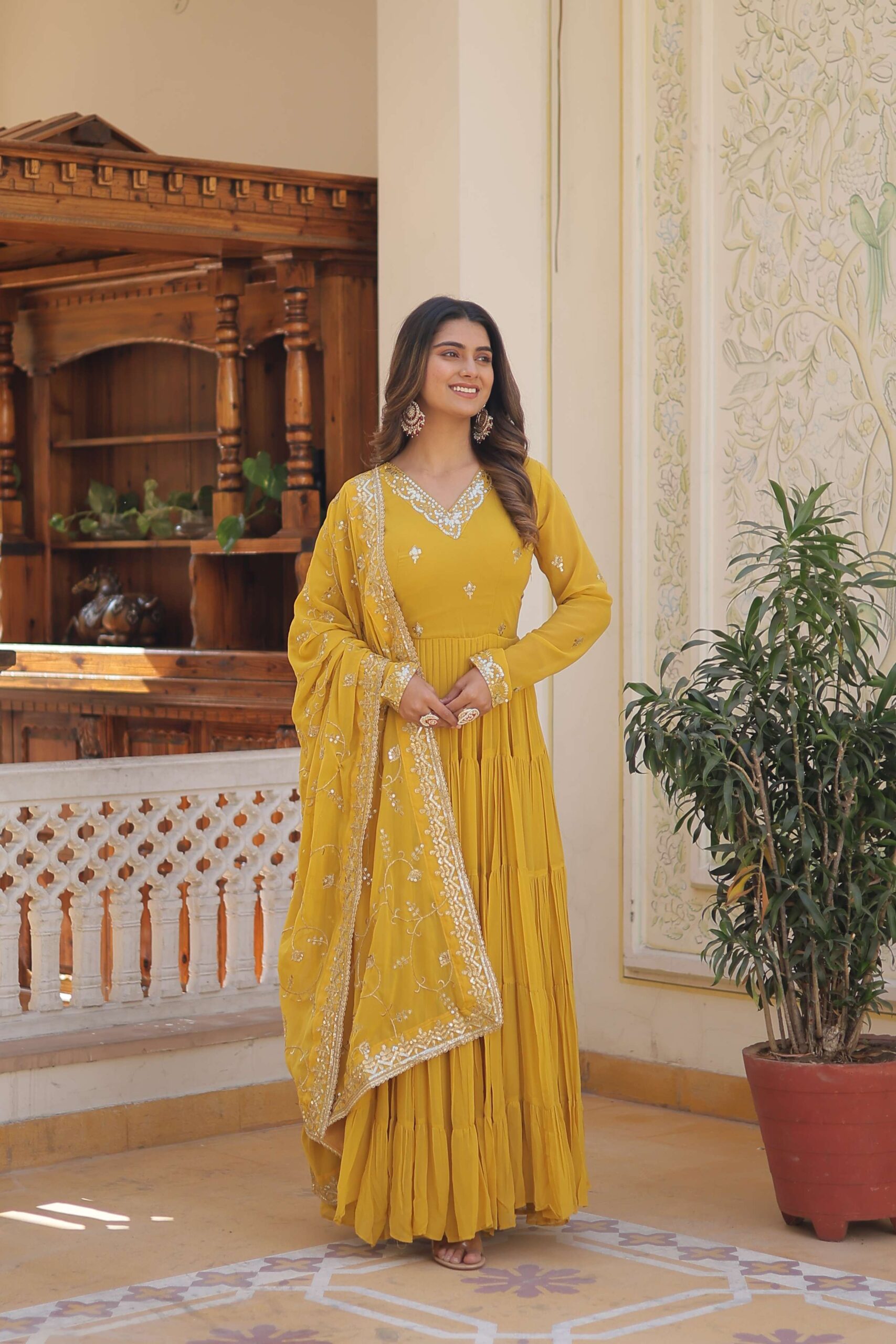 Be the first to review “Yellow Faux Georgette Designer Gown with Sequined Dupatta – Fully Flared Elegant Party & Wedding Set”